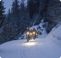 Le VTT sur la neige c'est possible ! Une assistance électrique te permet de rouler sur des sentiers de tout niveau.